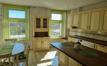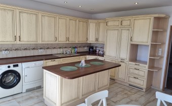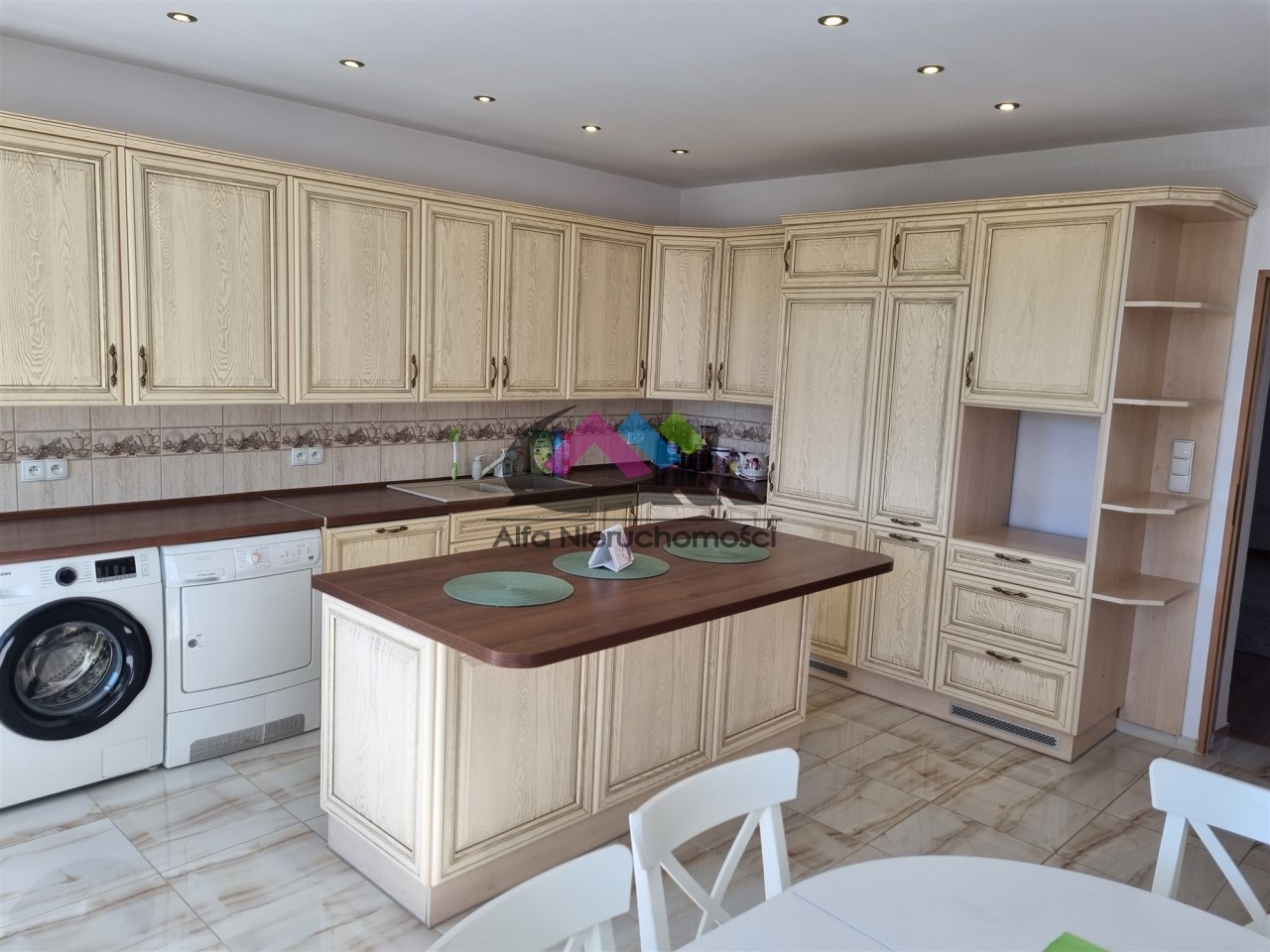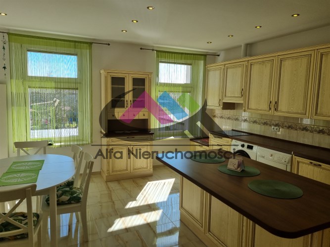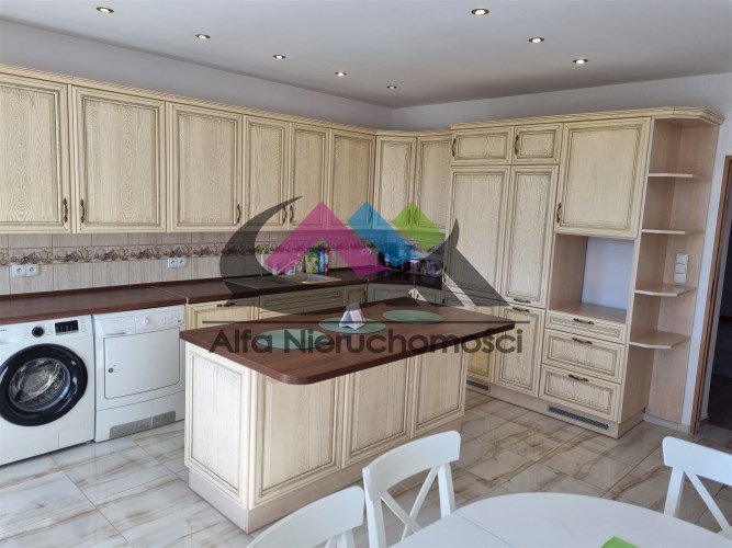 W pełni umeblowana dębowa kuchnia z wyspą. Sprzęt AGD: płyta, zmywarka marki Bosch, lodówka i suszarka marki Electrolux, pralka Samsung pozostają w cenie !!!